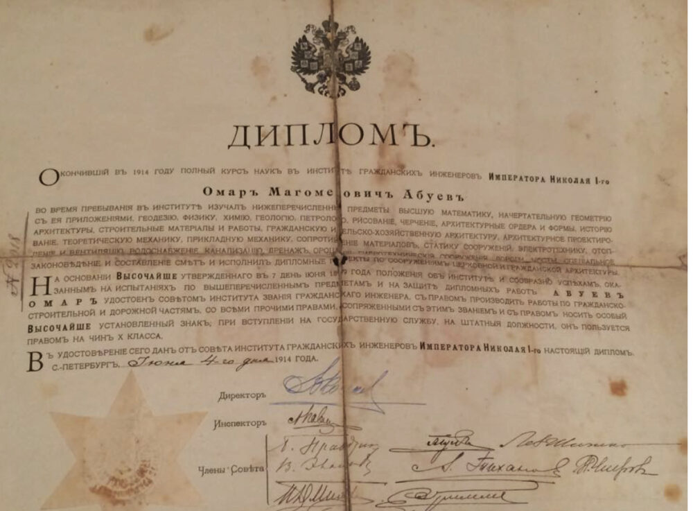 1914 шинал июльданий институт къуртал бувшиврул справка дур. Вава зуруй дипломгу хIадурну бикIантIишиву бусласисса. Циняв документру чIал къабувну гьан бувну бур Ккавкказуллал округрайн.